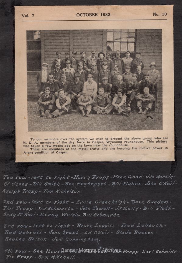 Chicago, Burlington and Quincy Railroad, Harry Propp, Hank Goad, Jim MacKinsi Jones, Bill Smith, Ben Pentecost, Bill Huber, John O'Neil, Adolph Trupp, Tom Nicholson, Ernie Greenhalgh, David W. Sundem, Phil Propp, W.J. Schwartz, John Powell, J.V. Kelly, Bill Floth, Andy McNeil, Kenny Welsh, Bruce Leggitt, Fred Lebsock, Red Gehrett, John Traut, Ed O'Neil, Slade Beeson, Reuben Nelson, Joe Cunningham, Lee House, Red Forbeck, Con Propp, Earl Schmidt, Vic Propp, Sam Mitchell, William SchwartzSubject Place