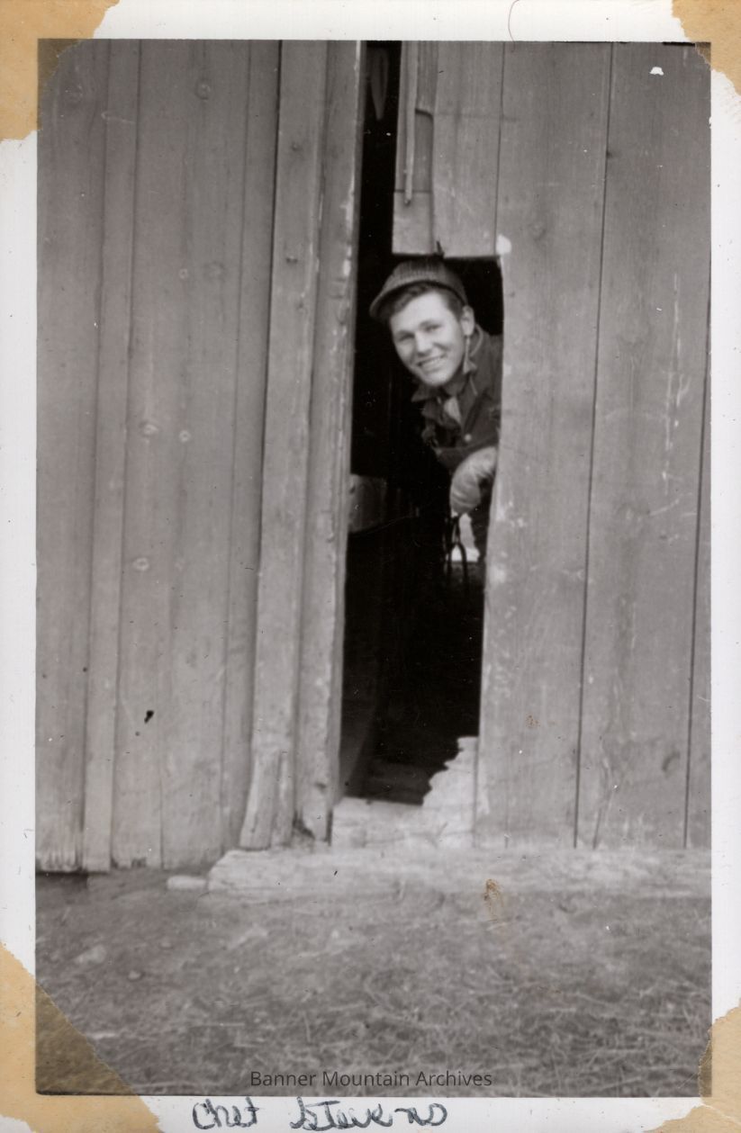 Chet Stevens looking through a hole in a barn, circa 1940s.