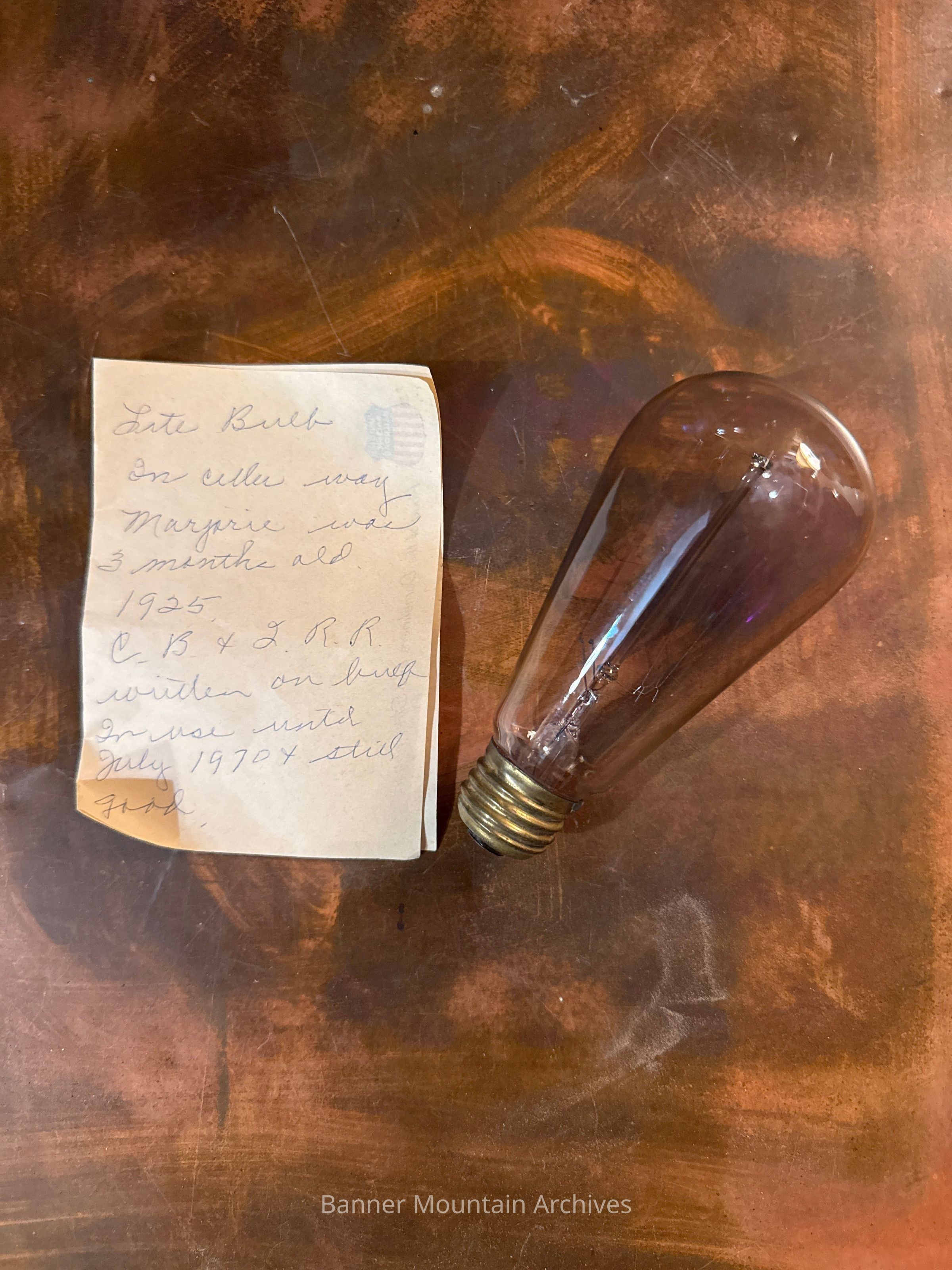 Light bulb marked CB&Q RR on the top of the bulb. Note with it "Lite bulb In cellar way Marjorie was 3 months old. 1925. CB&Q RR writted on bulb. In use until early 1970 & still good." Tested and still works, circa 1920s.Made/Created