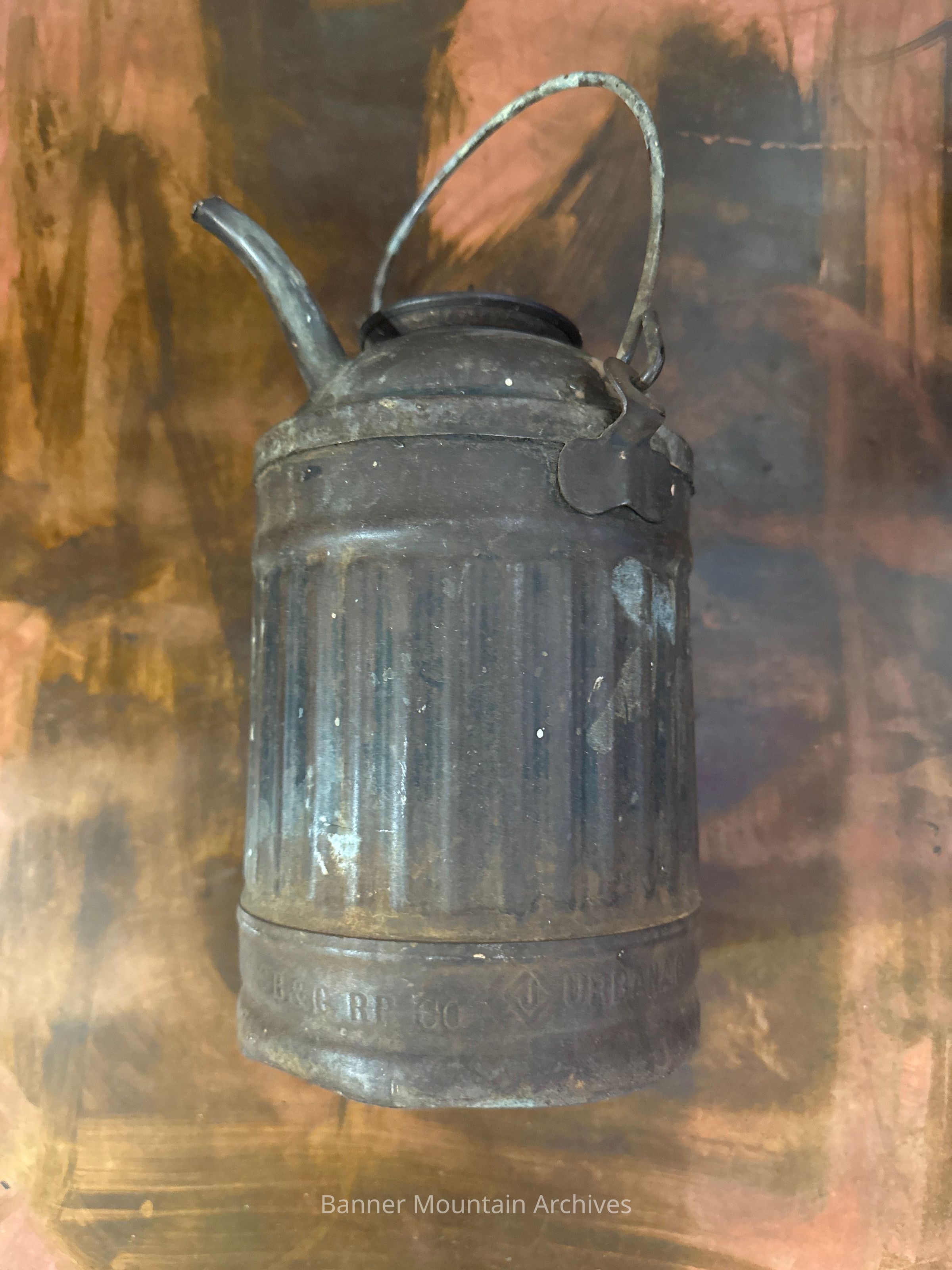 Chicago, Burlington and Quincy railroad oil can, stamped at base CB&Q RR CO, J in a diamond, Urbana. O.