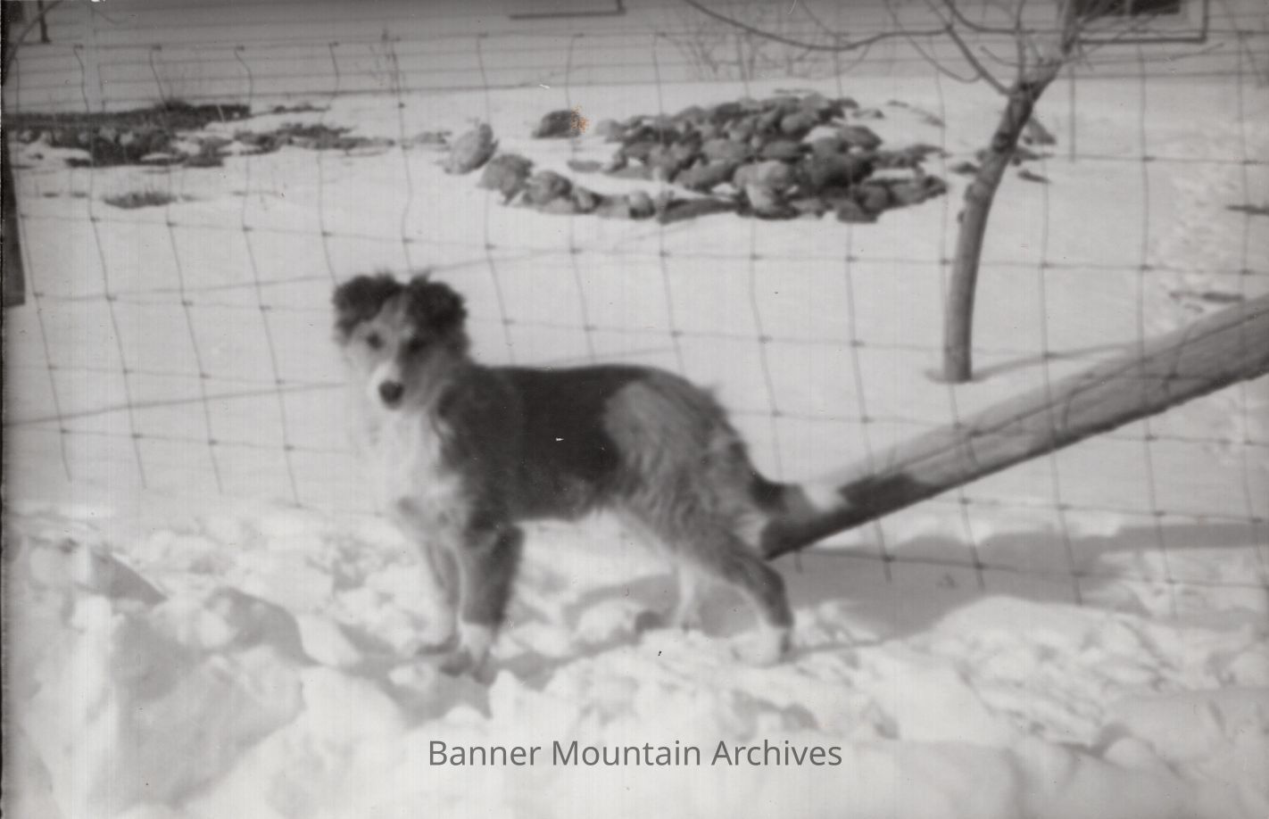 Dog in the snow at the Banner Ranch, circa 1930s.