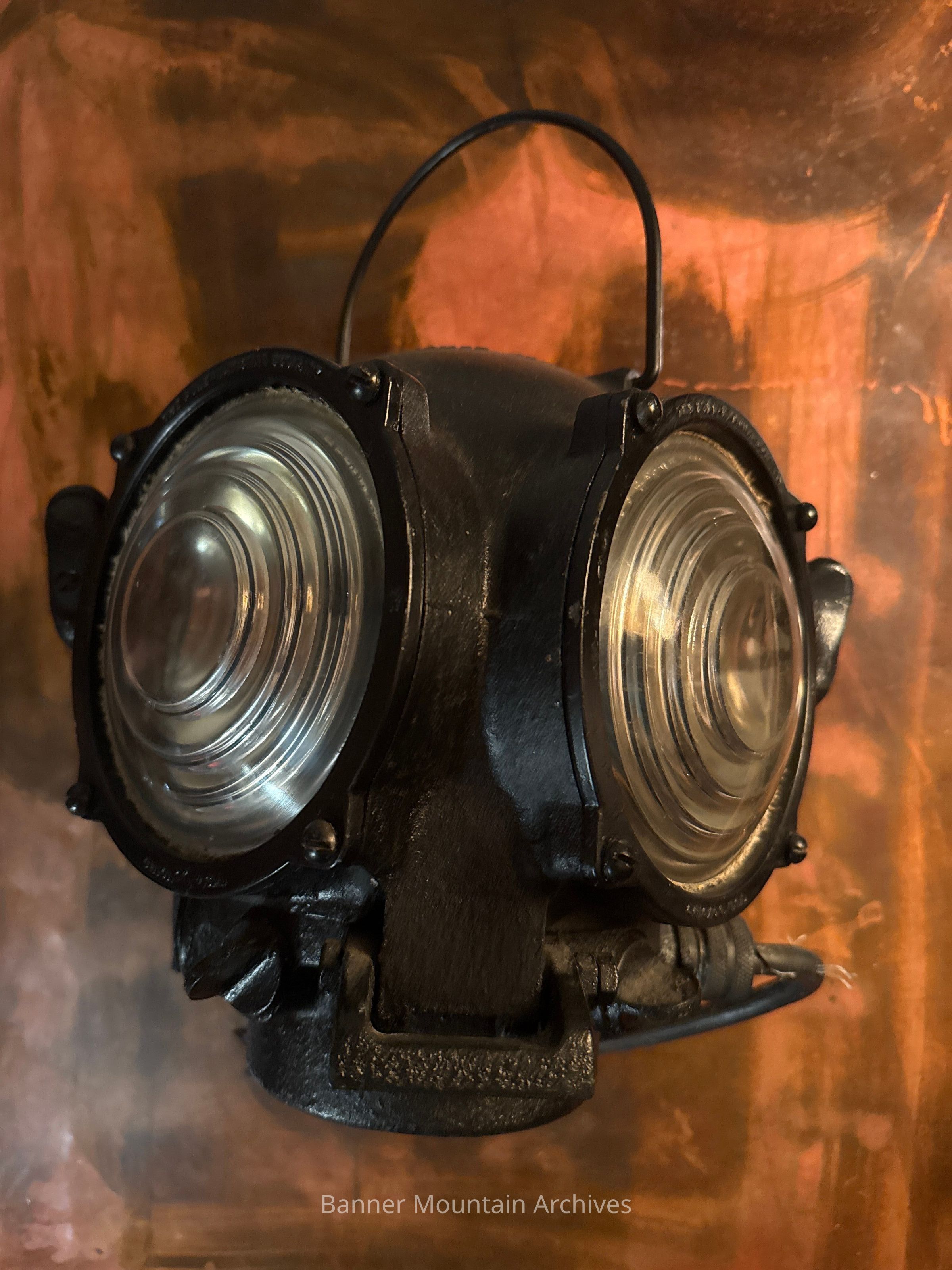 Cannonball style class lamp, white lenses, lever turns down green lens behind main ones, electric powered.Category