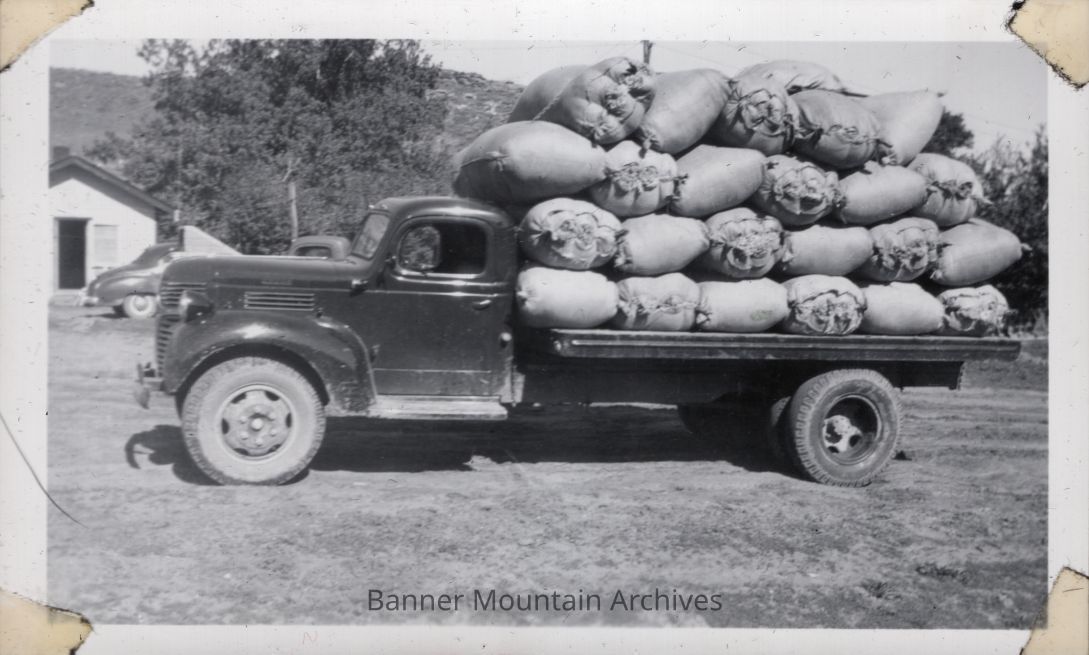 Ranch truck loaded with wool sacks, Banner Ranch, circa 1940s.