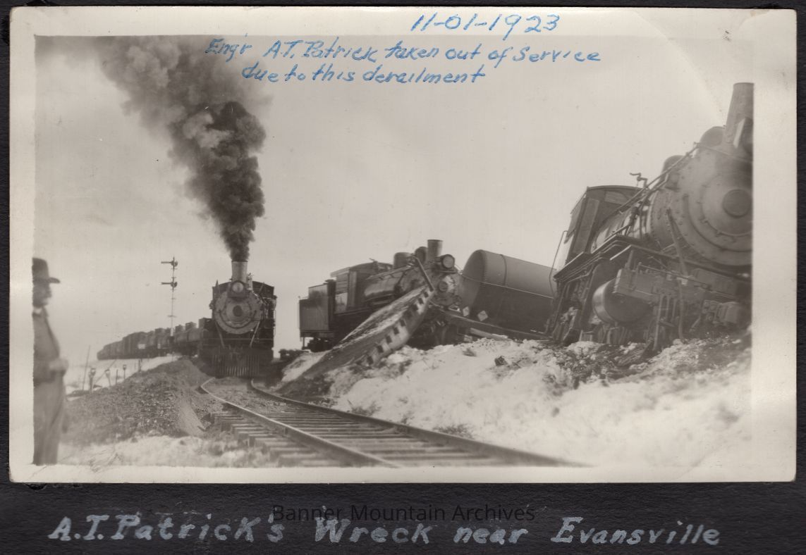 Train wreck on the Chicago, Burlington and Quincy near Evansville, WY, showing derailed equipment and a freight train using a shoefly around the wreck site, Engineer on the wreck was A.T. Patrick who was taken out of service, November 1, 1923.