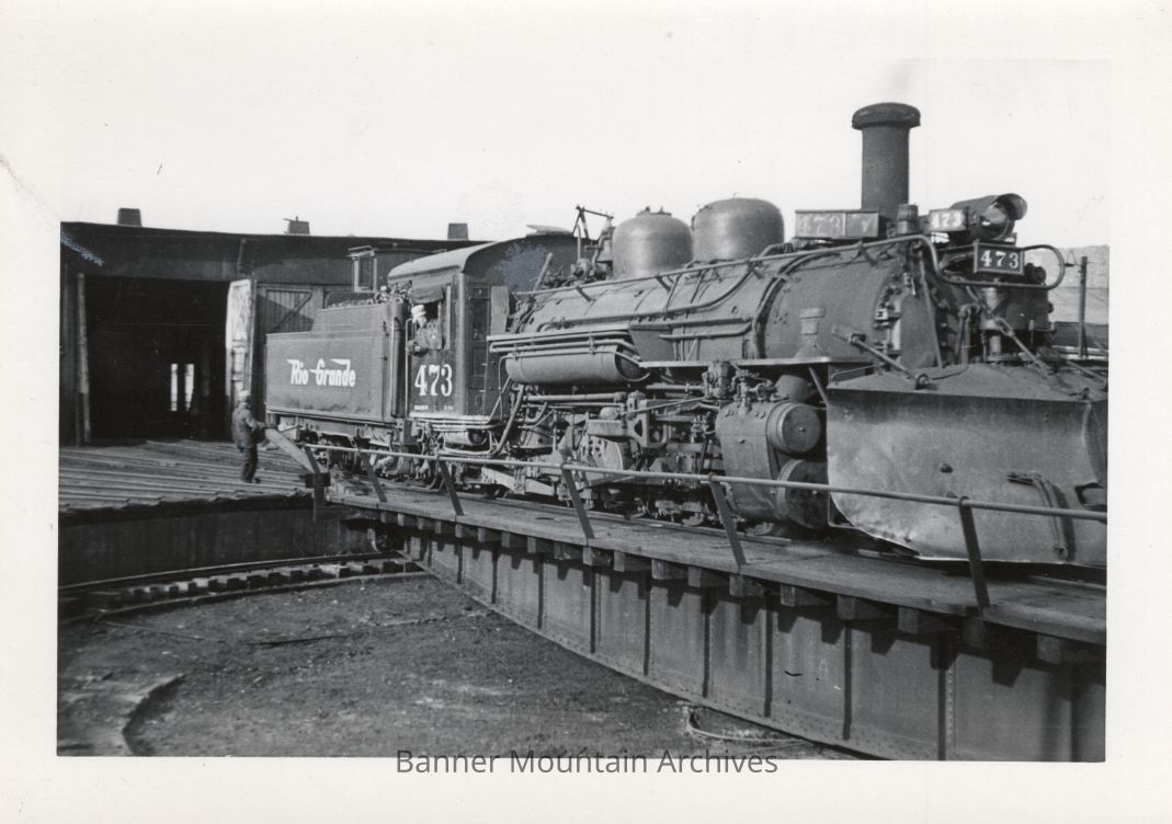 Denver & Rio Grande #473 on a turntable, crew member at turntable beam, engineer in cab window.