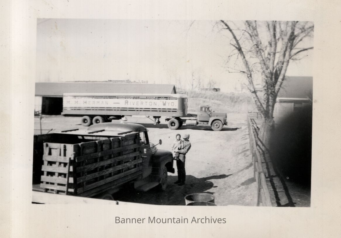 H.H. Herman trucks in the company yard, owner holding his nephew, Riverton, WY, circa 1950s.Photograph Details