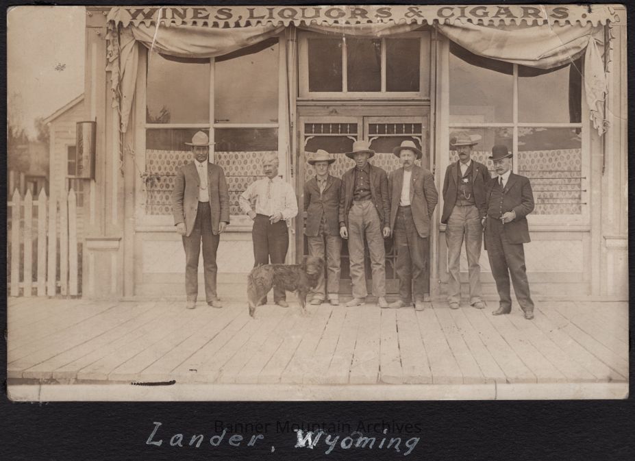 Group with a dog in front of a bar in Lander, circa 1920s.