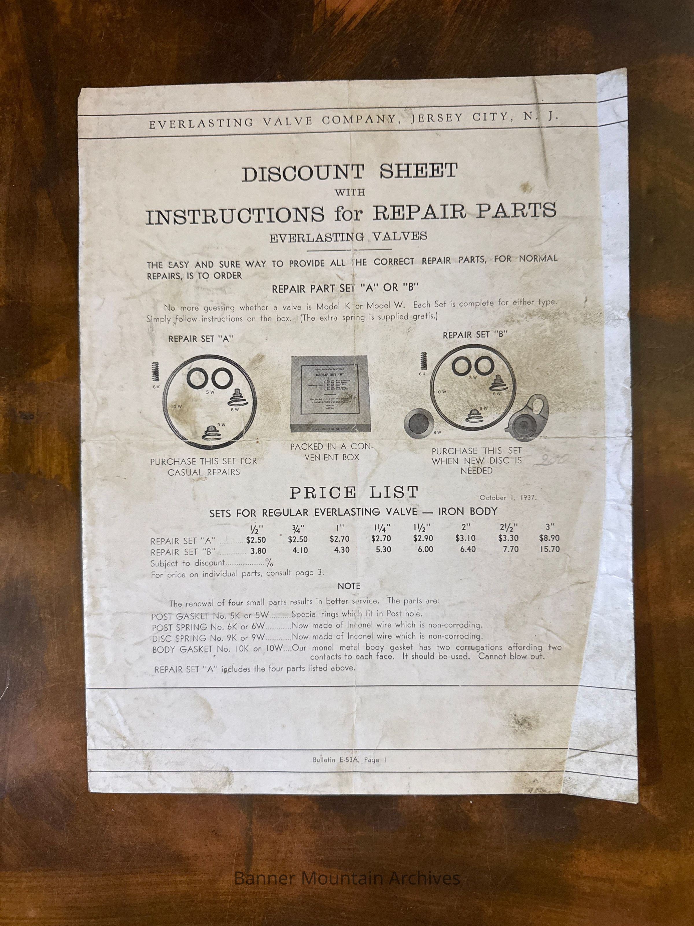 Discount sheet with instructions for repair parts for Everlasting Valves from the Everlasting Valve Co.
