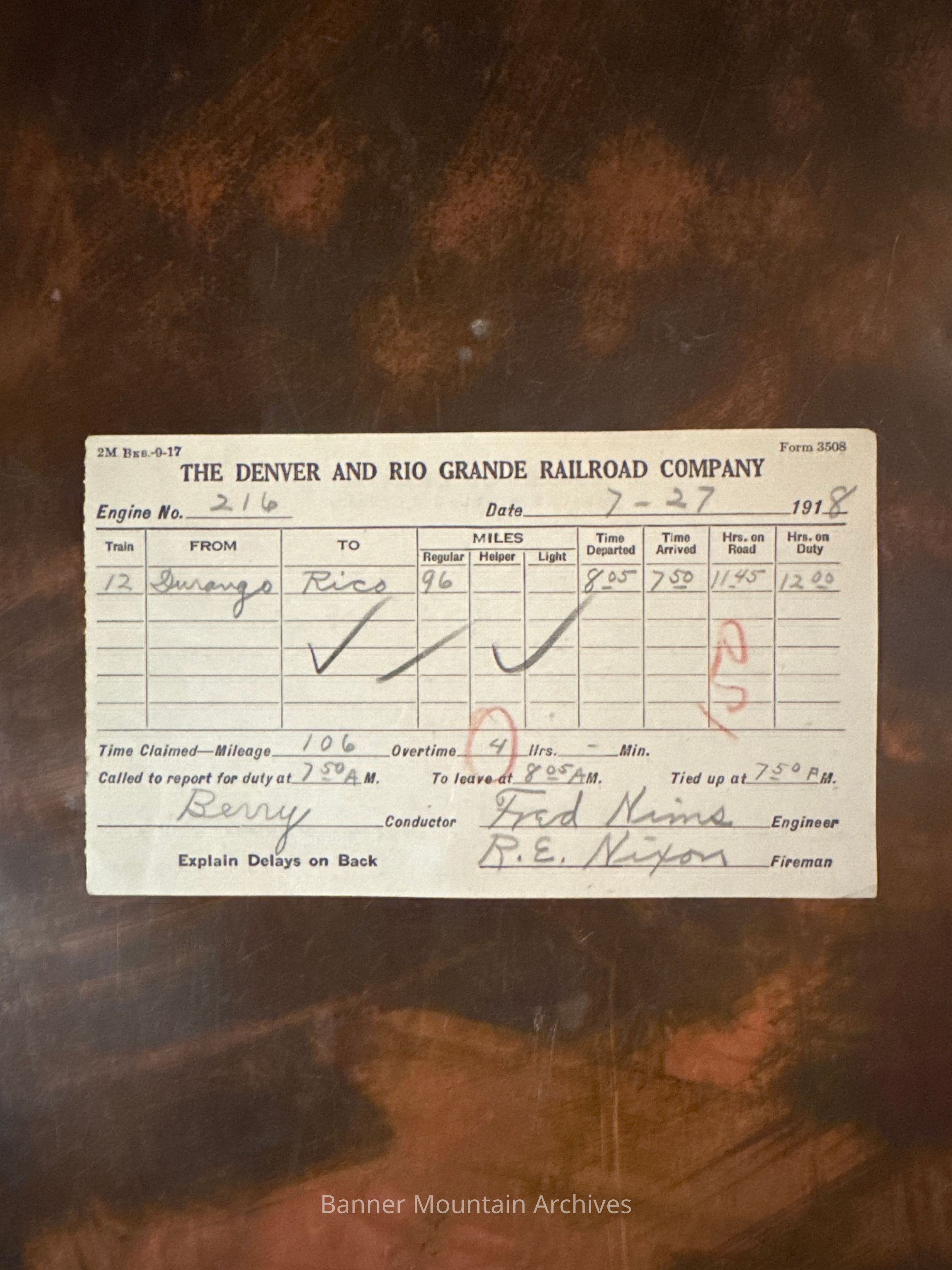 Denver and Rio Grande engine and crew time report for engine #216 on train no. 12 from Durango to Rico, Colorado, July 27, 1918.