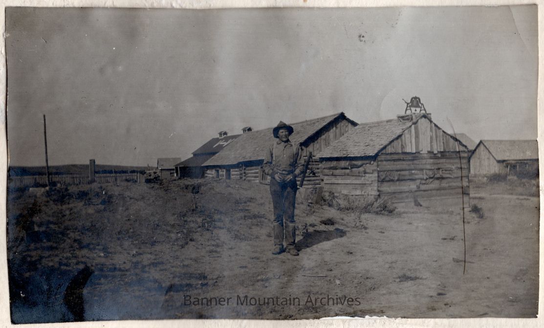 Hired hand in front of the barns.