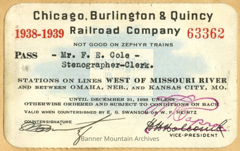 Chicago, Burlington & Quincy Railroad pass for Floyd Cole, Stenographer and Clerk, 1938-1939.