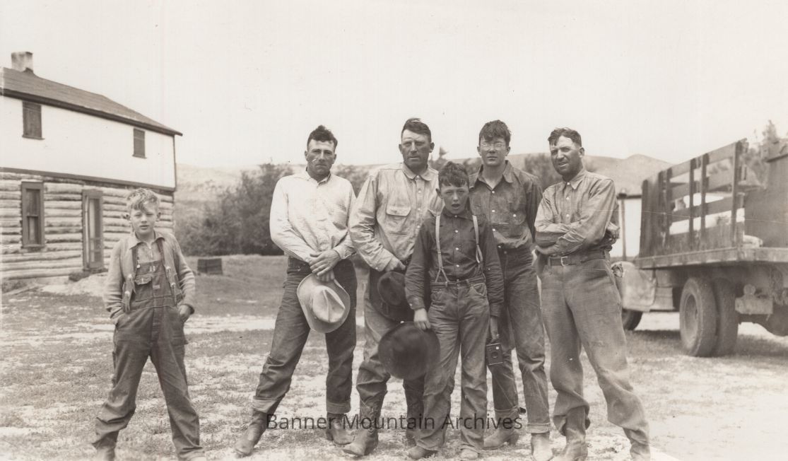 Group at a ranch, left to right: Jim Spurlock, John Kirkpatrick, Pete Rice, Dick Spurlock, Homer Lathrop and Roy Spurlock.