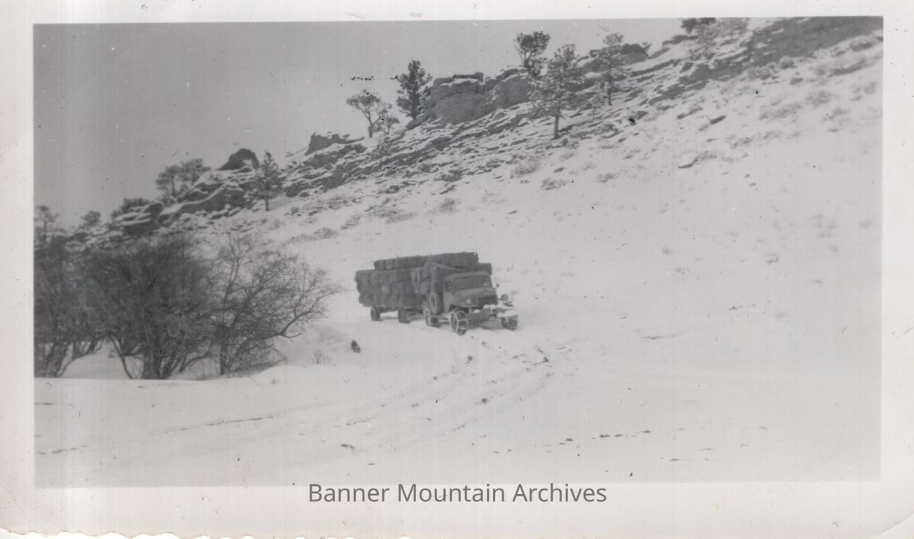 Feed truck and wagon loaded with hay in the snow, circa 1950s.