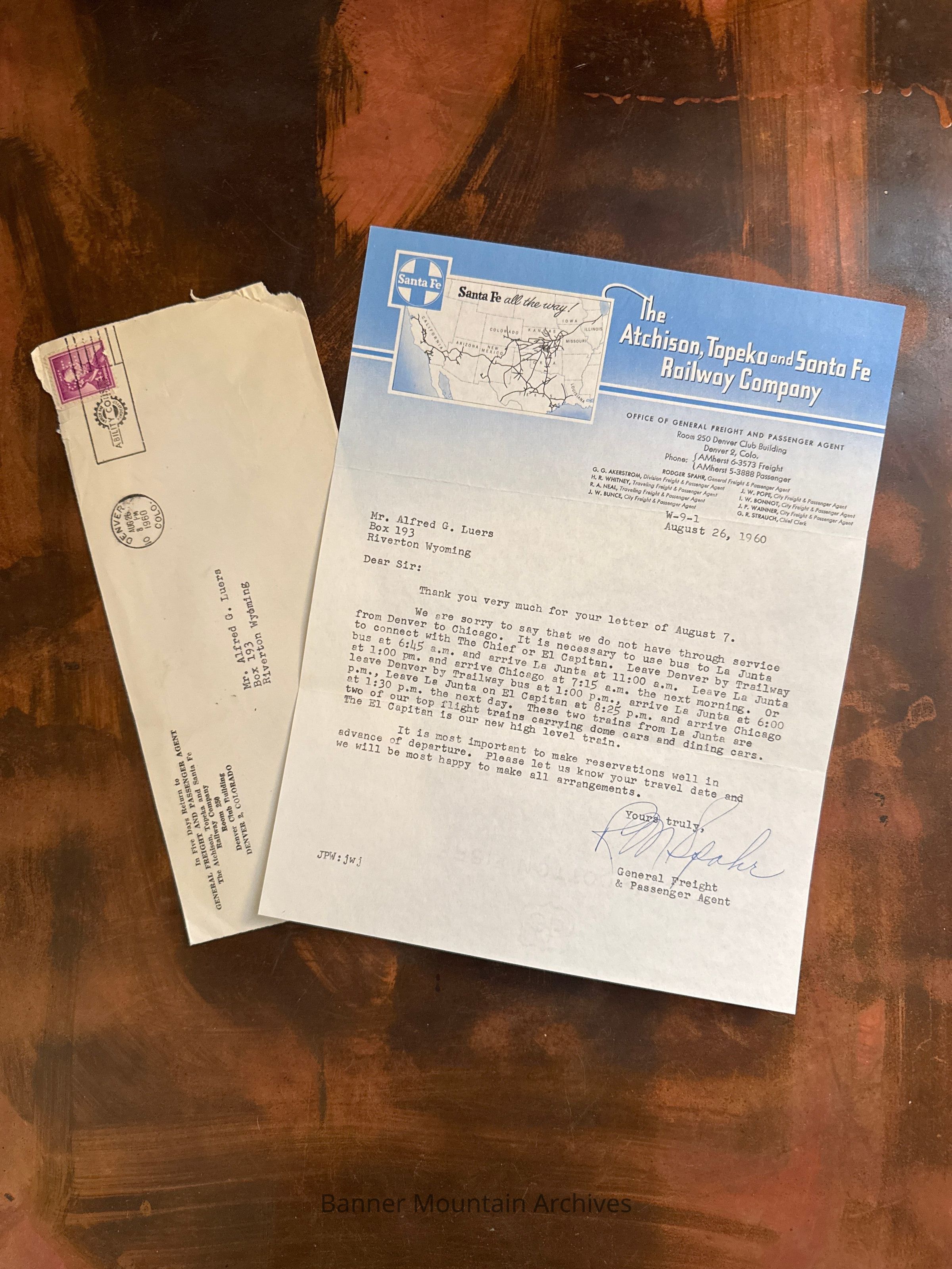 AT&SF envelope sent to Alfred Luers of Riverton, WY, 1960.Creator