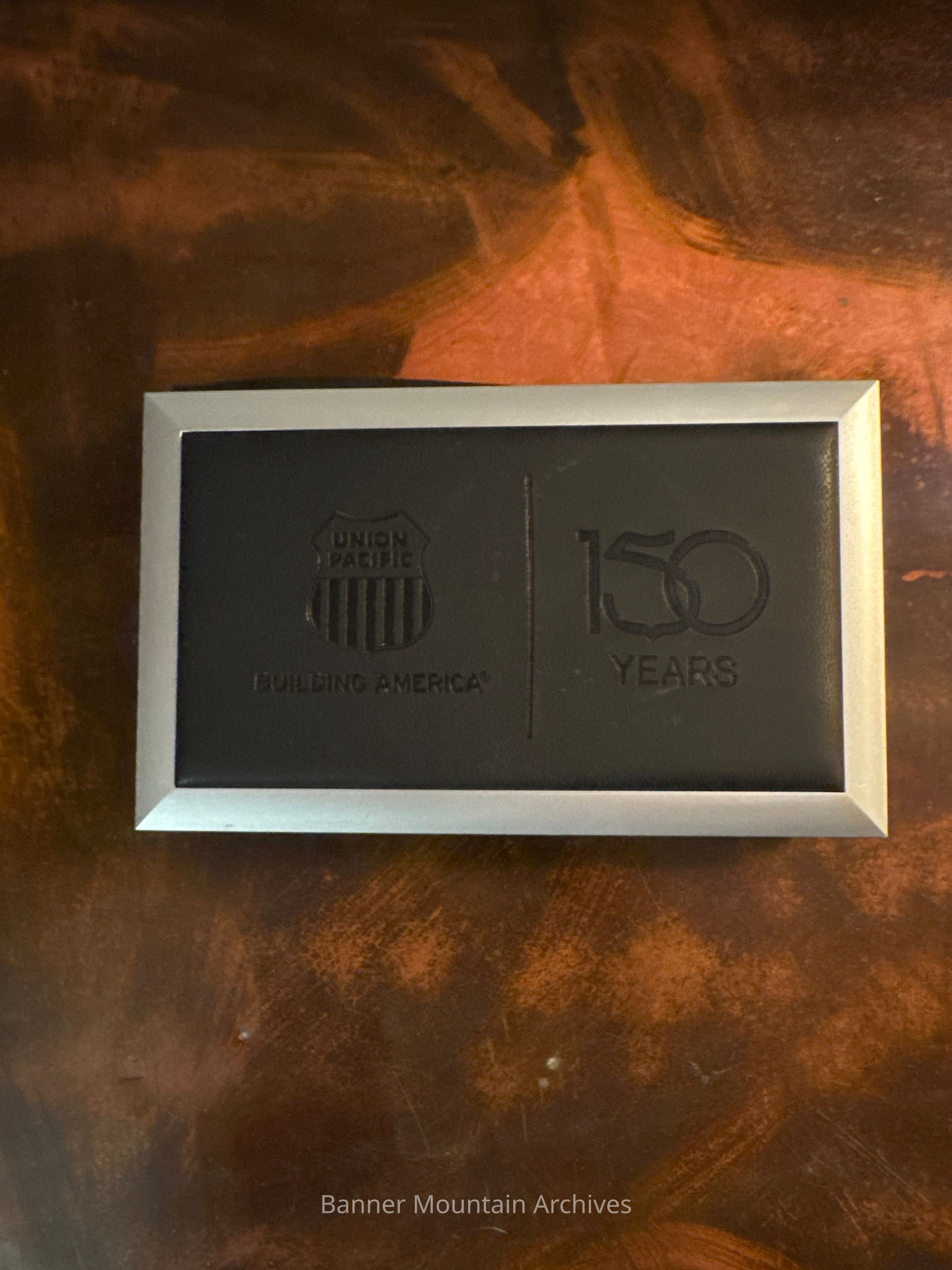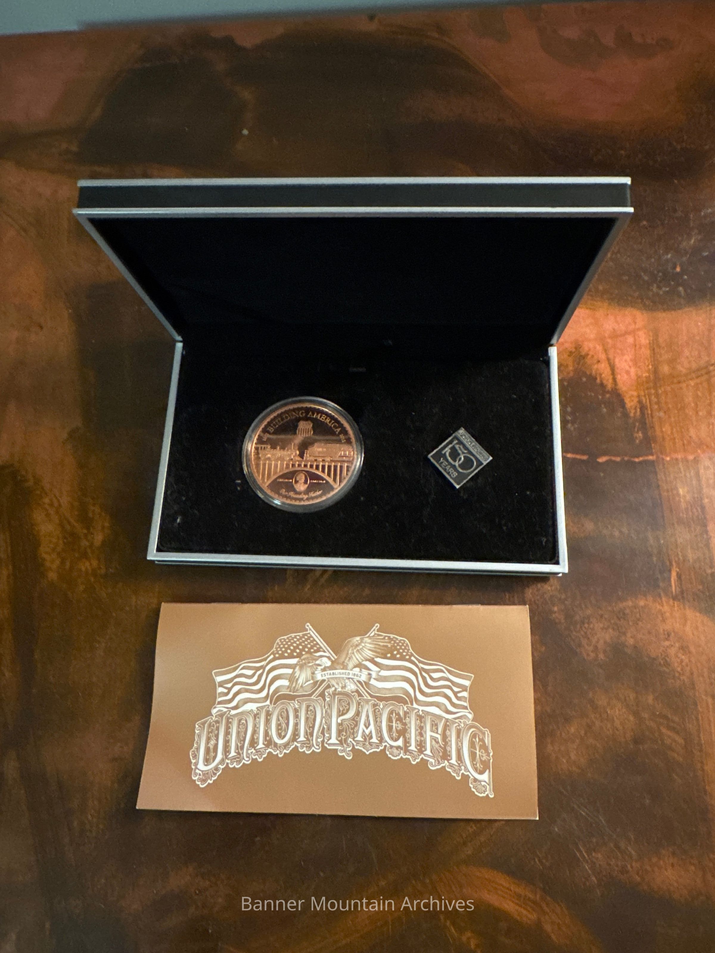Union Pacific commemorative coin and lapel pin given to employees in commemoration the 150th anniversary of the completion of the Transcontinental Railroad, with box and booklet, 2012.Category