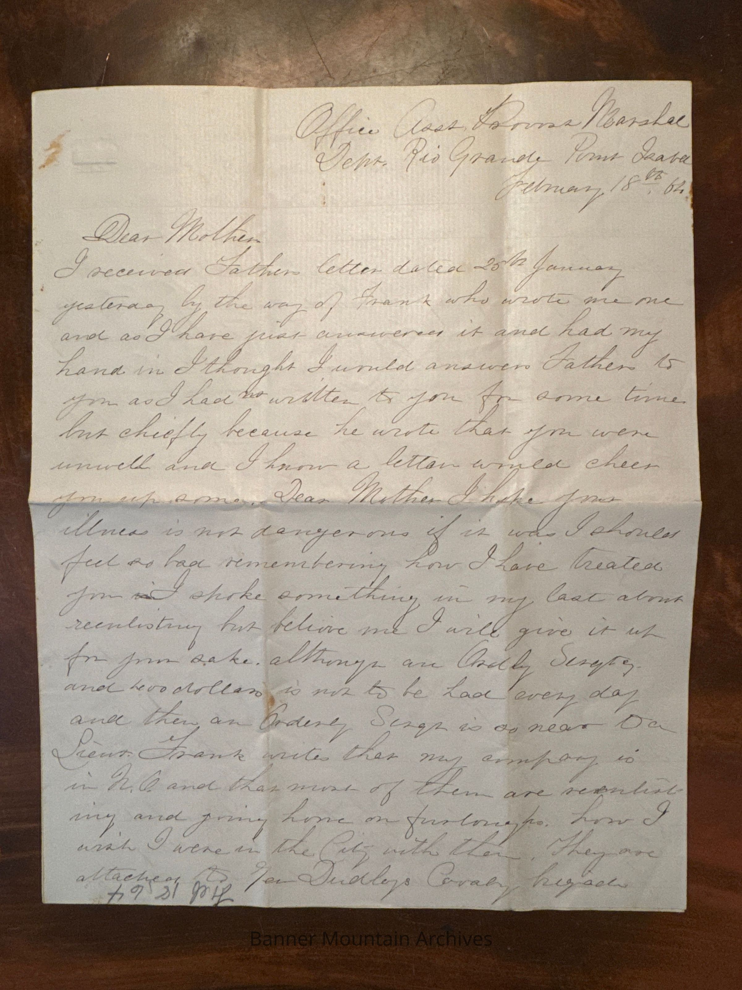Letter from Dudley E. Gale, Office of the Assitant Provost Marshall Department, to his moth, February 18, 1864.Subject Person/Organization