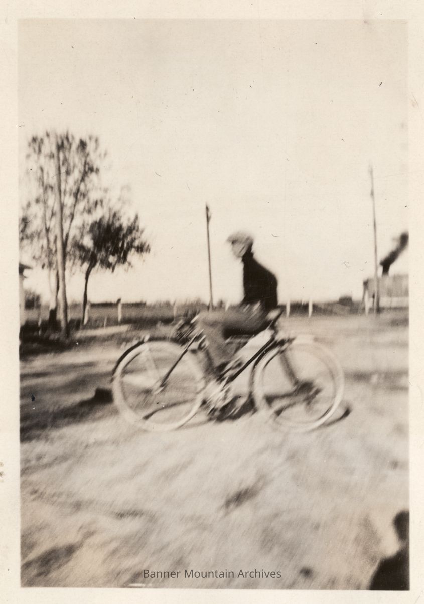 Tom Cole riding a bicycle backwards on West "E" Street, Casper, circa 1920s.