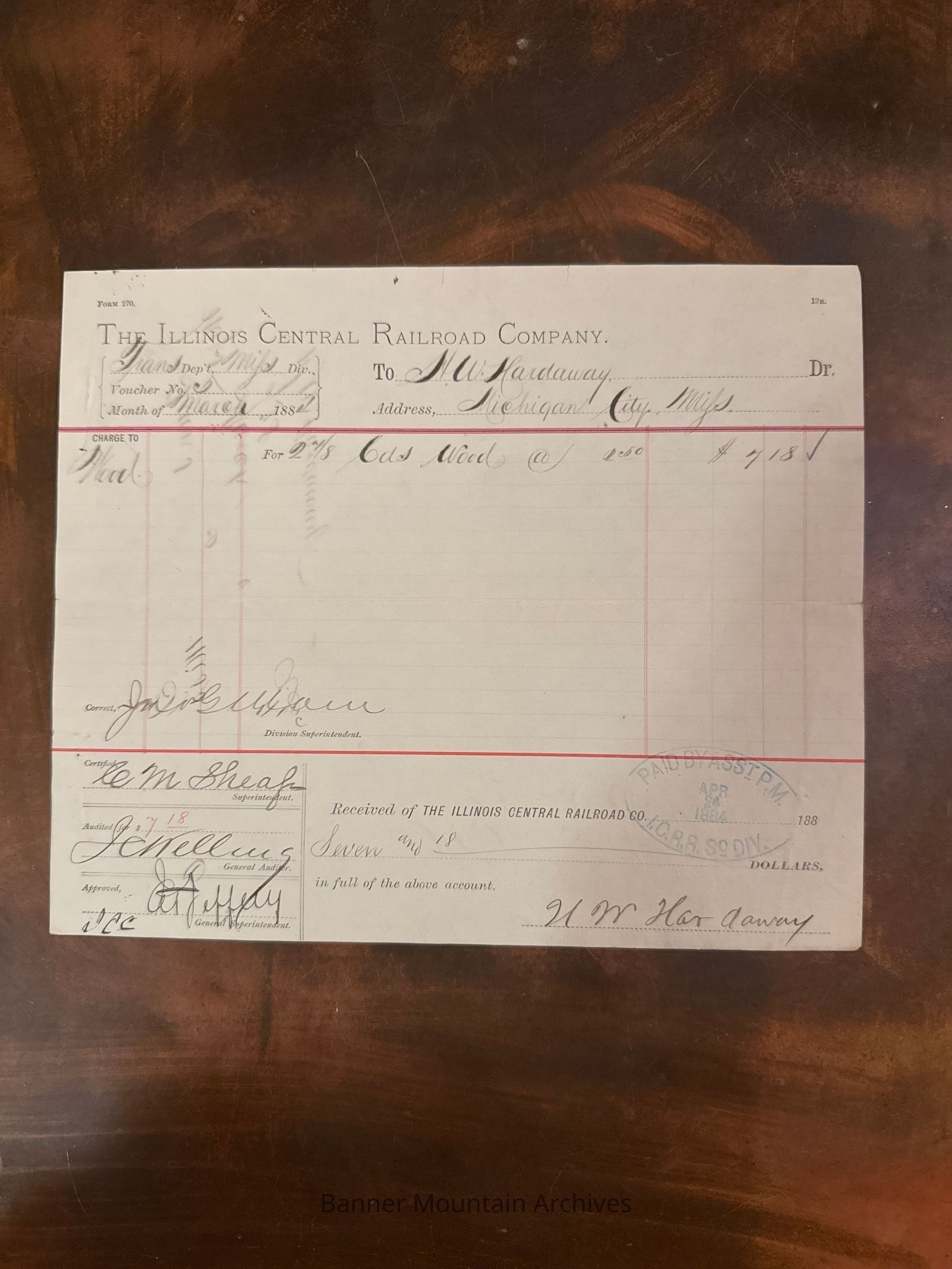 Illinois Central Railway bill to H.W. Hadaway, March 1884.