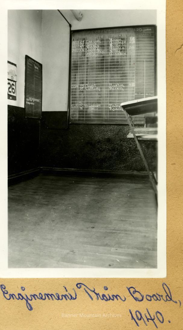 Chicago, Burlington & Quincy Railroad enginemen's train board in the Casper roundhouse, 1940.