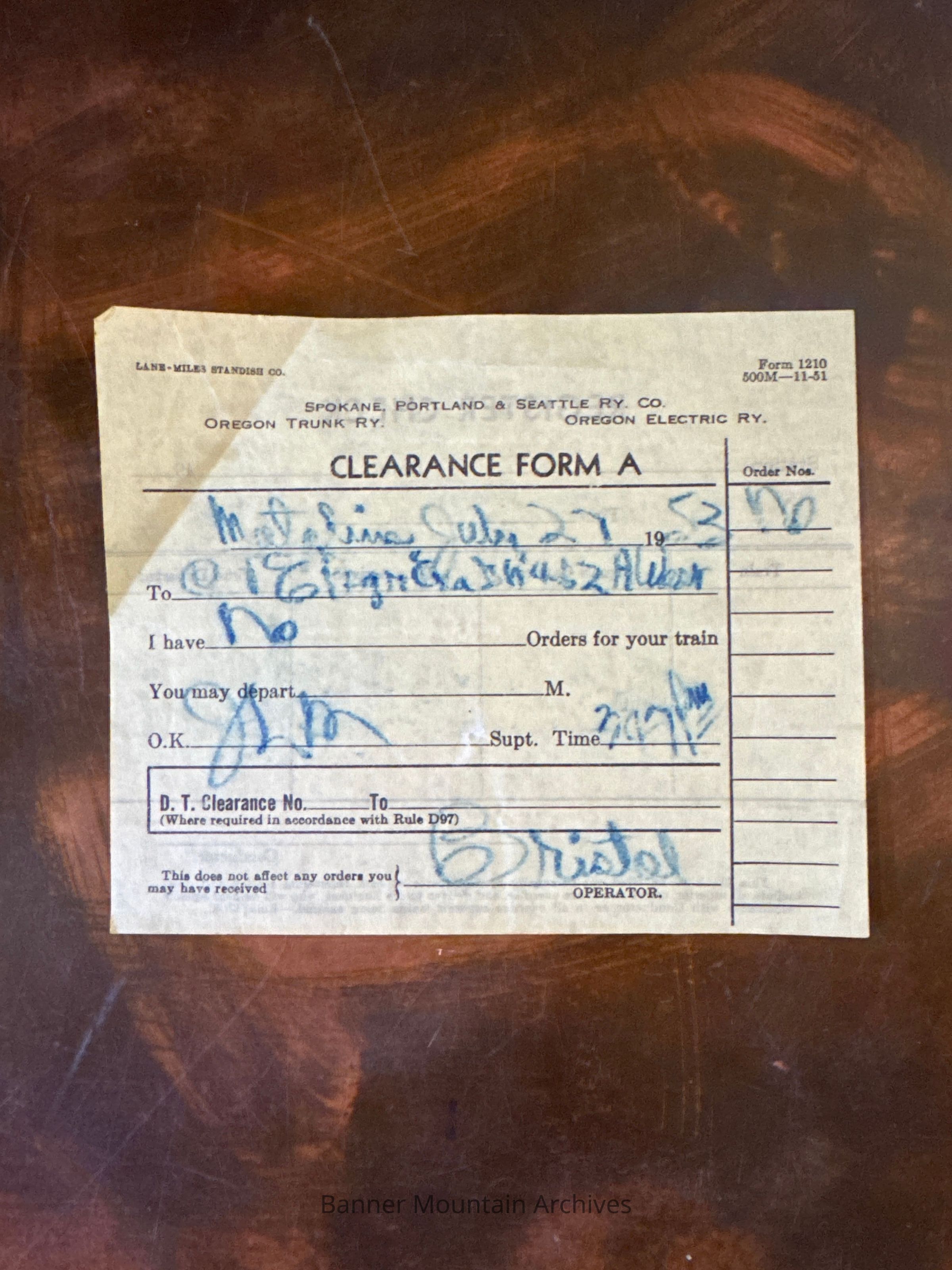 Spokane, Portland and Seattle Railway clearance form A, July 27, 1953.