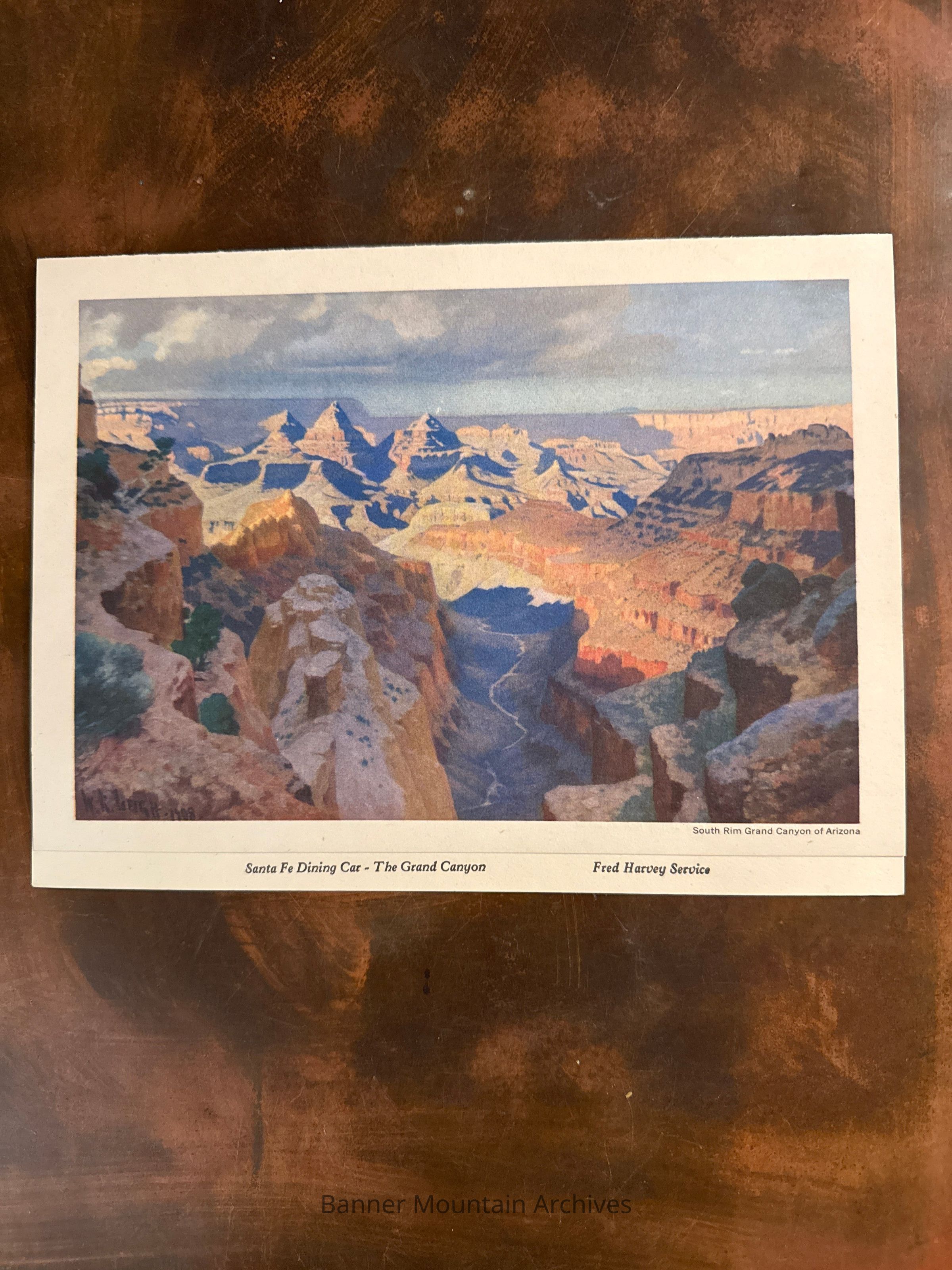 AT&SF dining car menu for Fred Harvey Service, image of the South rim of the Grand Canyon.