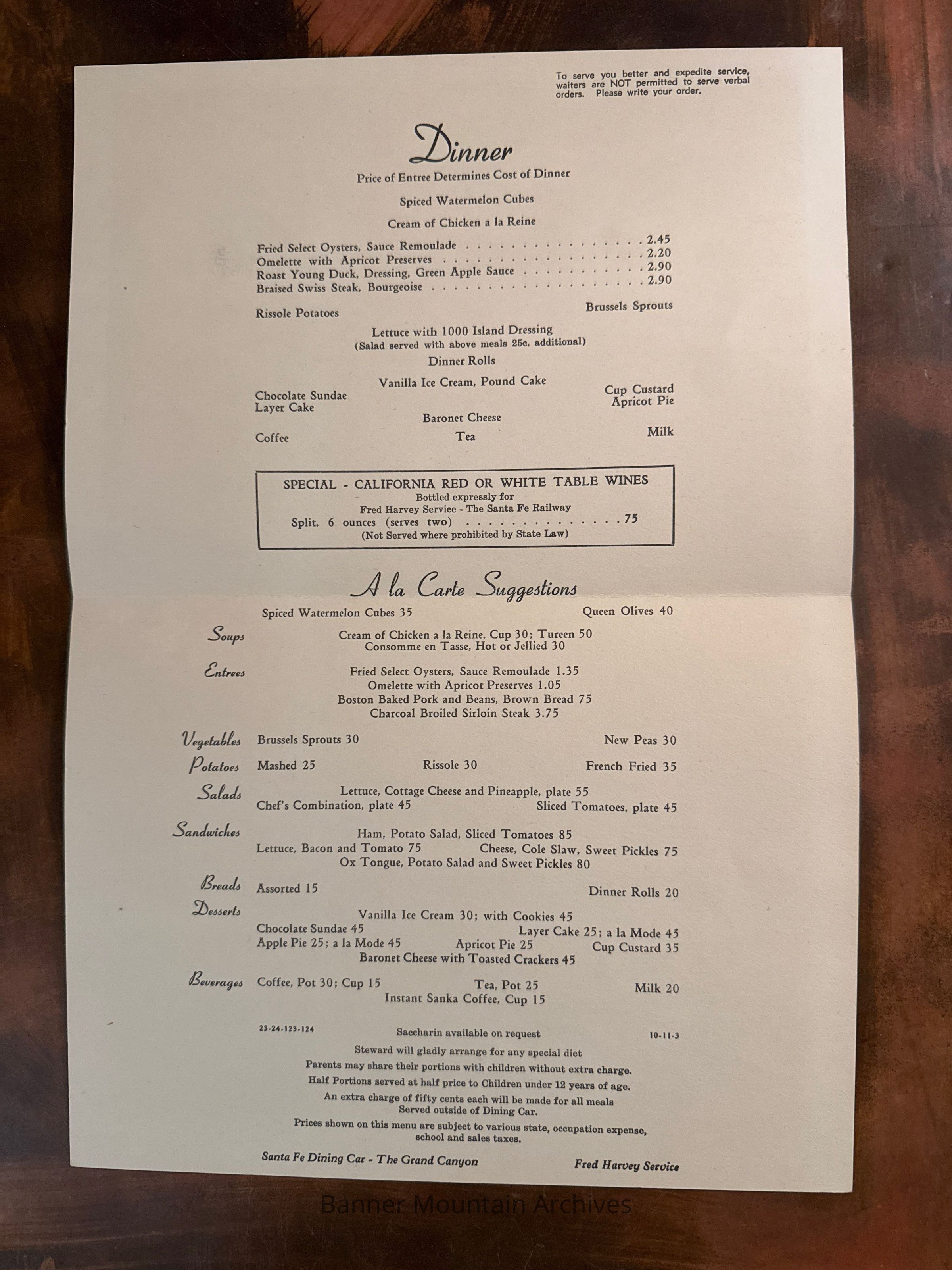 AT&SF Harvey Menu-Grand Canyon