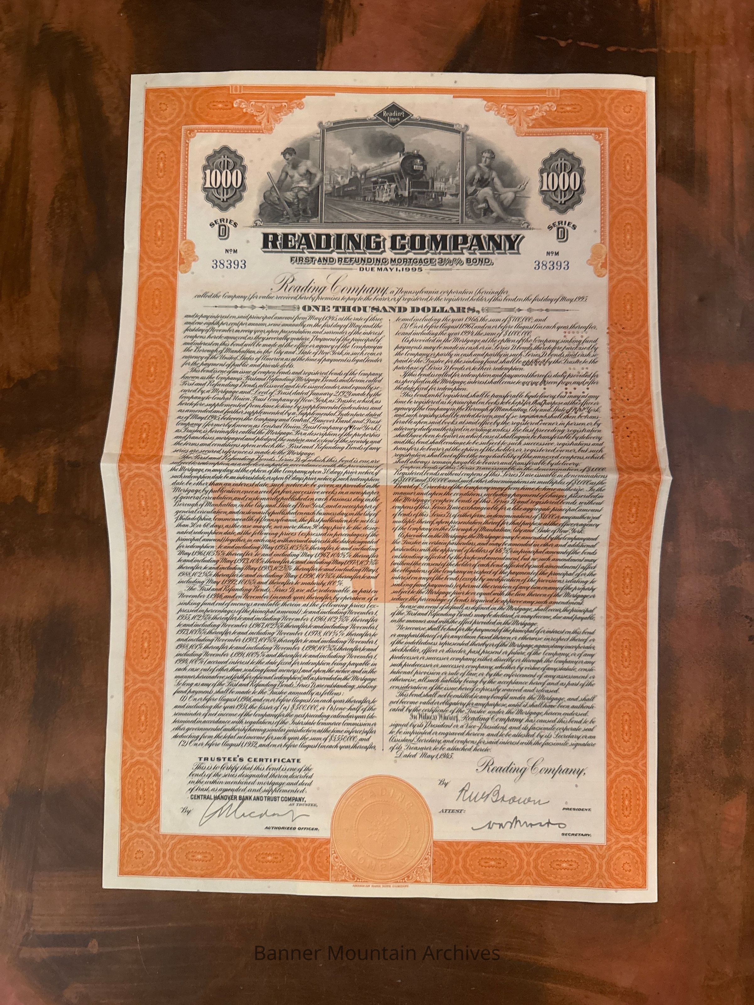 Reading Company bond certificate for $1,000, issued May 1, 1945.