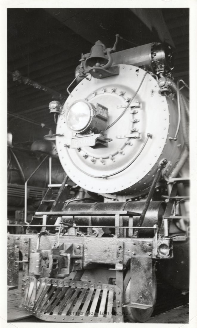 Chicago, Burlington & Quincy steam locomotive #5506 in the roundhouse in Casper, circa 1940s.