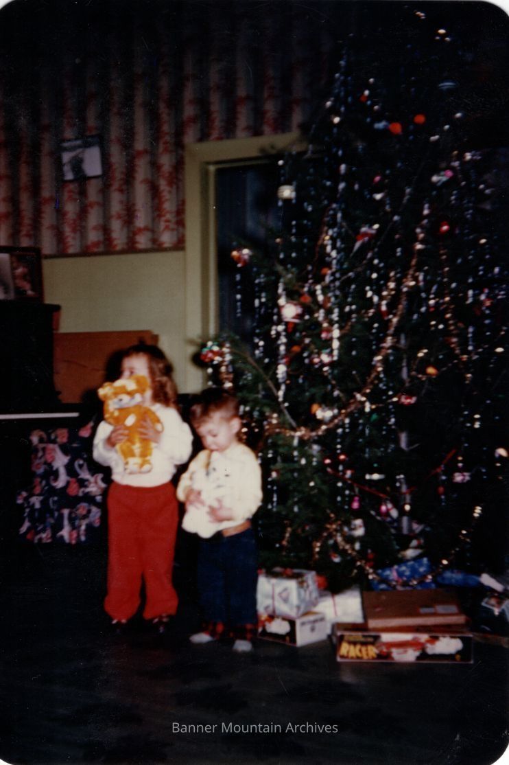 Margo and DL Squibb in the original ranch house next to the Christmas tree, Banner Ranch, 1953.Photograph Details