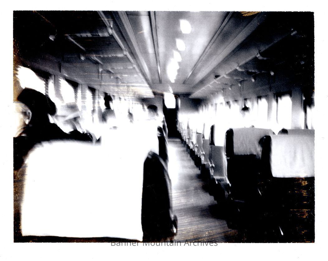 Interior of Chicago, Burlington and Quincy Railroad coach #4520 on train number 30, August 11, 1967. Conductor Arneson to the left.