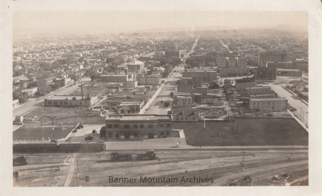 Chicago, Burlington and Quincy Railroad depot taken from the powerplant smokestack, Casper, 1926.