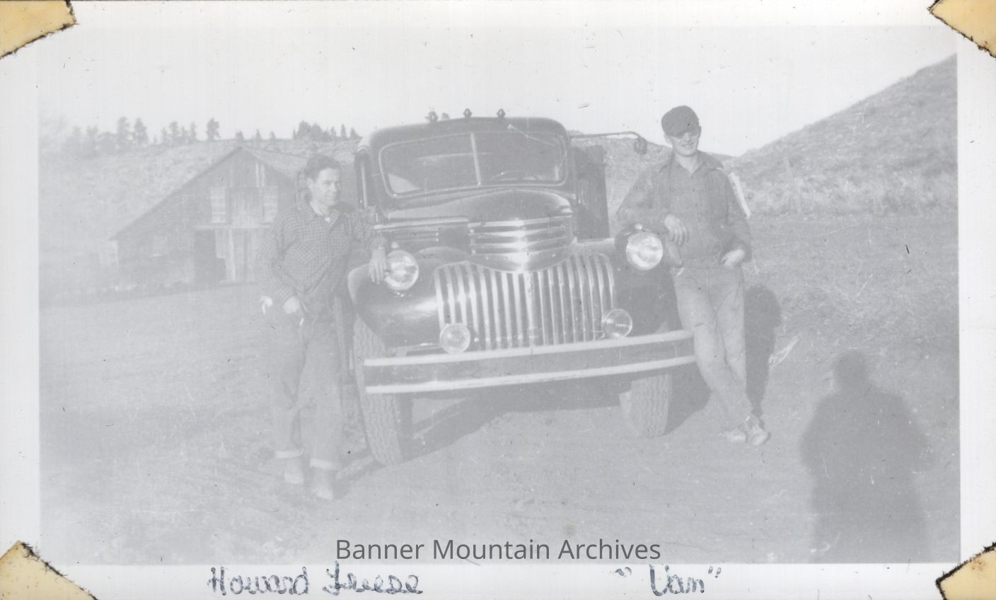 Howard Freese and Delbert Vanwinkle with a ranch truck, Banner Ranch, circa 1940s.