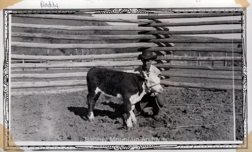 Bryant "Cactus" McCleary with a Hereford calf in a halter, Banner Ranch, circa 1940s.Photograph Details