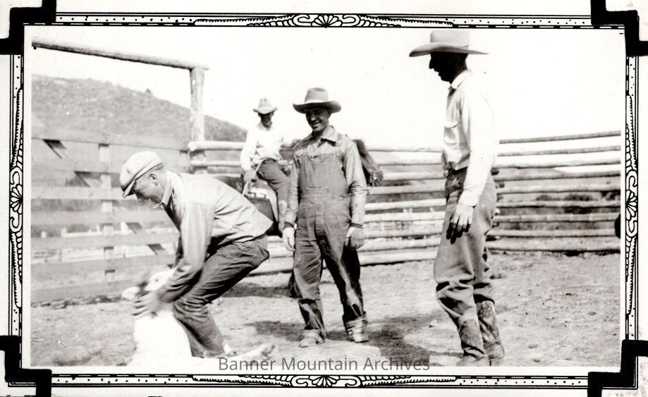 John, Houston, Ed and Mike McCleary branding Lena's while calf, circa early 1930s.Photograph Details
