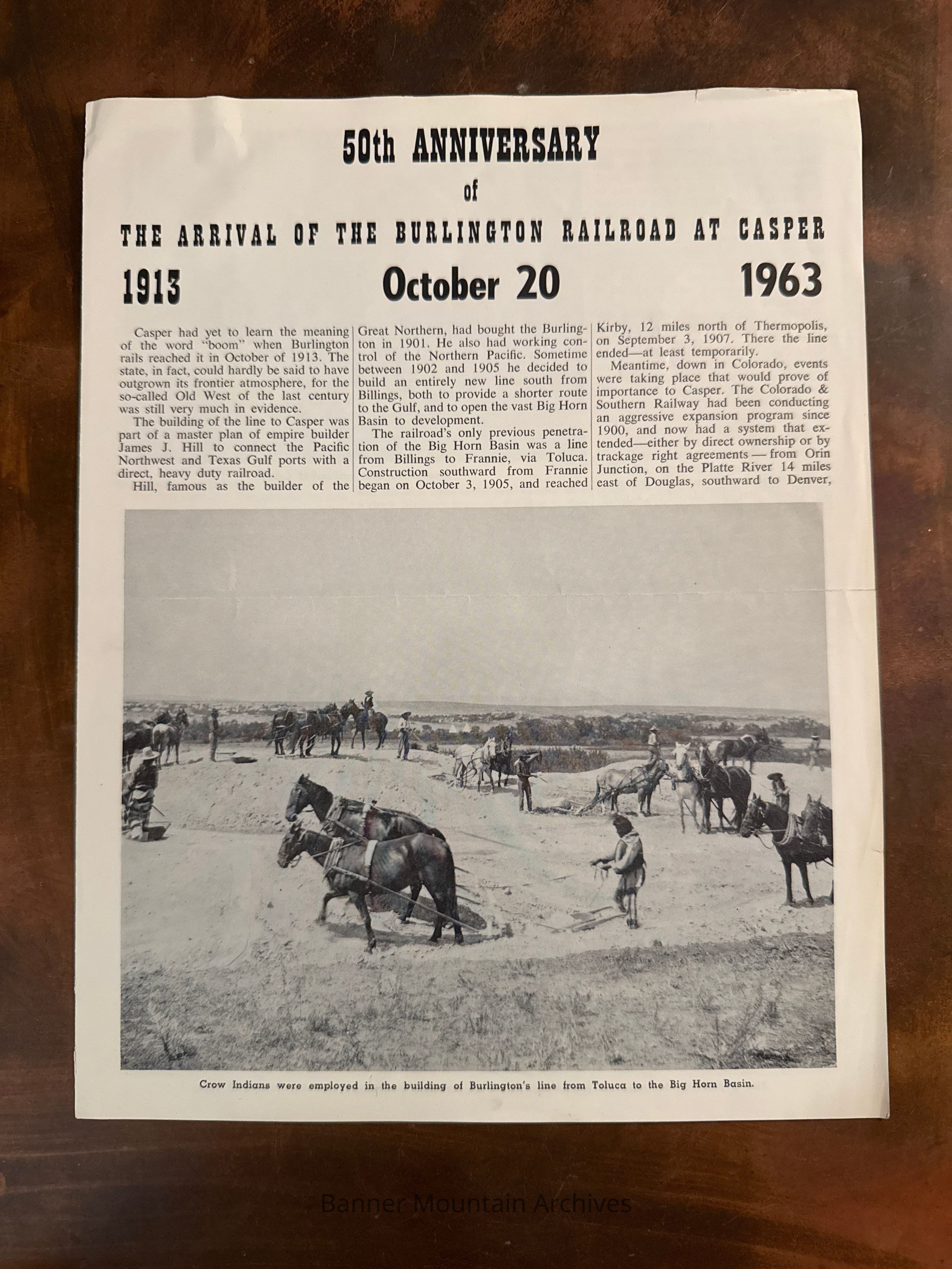Handout for the 50th Anniversary of the arrival of the CB&Q to Casper with the history of the railroad, October 20, 1963. Was only given to passengers aboard the special anniversary excursion.Creator