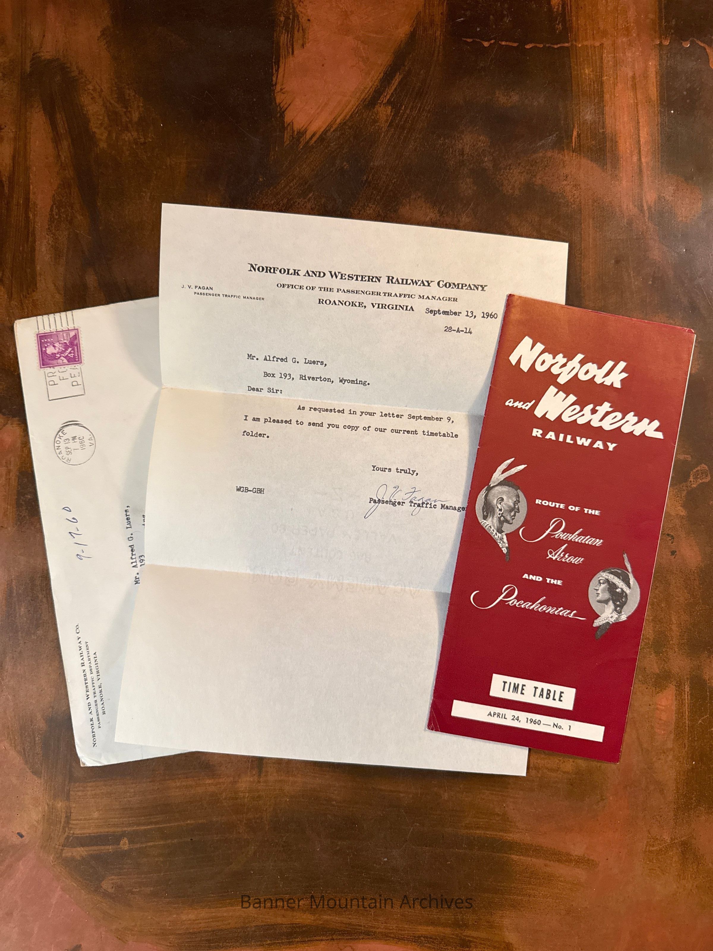 Norfolk and Western Railway envelope sent to Alfred Luers of Riverton, WY, received September 17, 1960.Creator