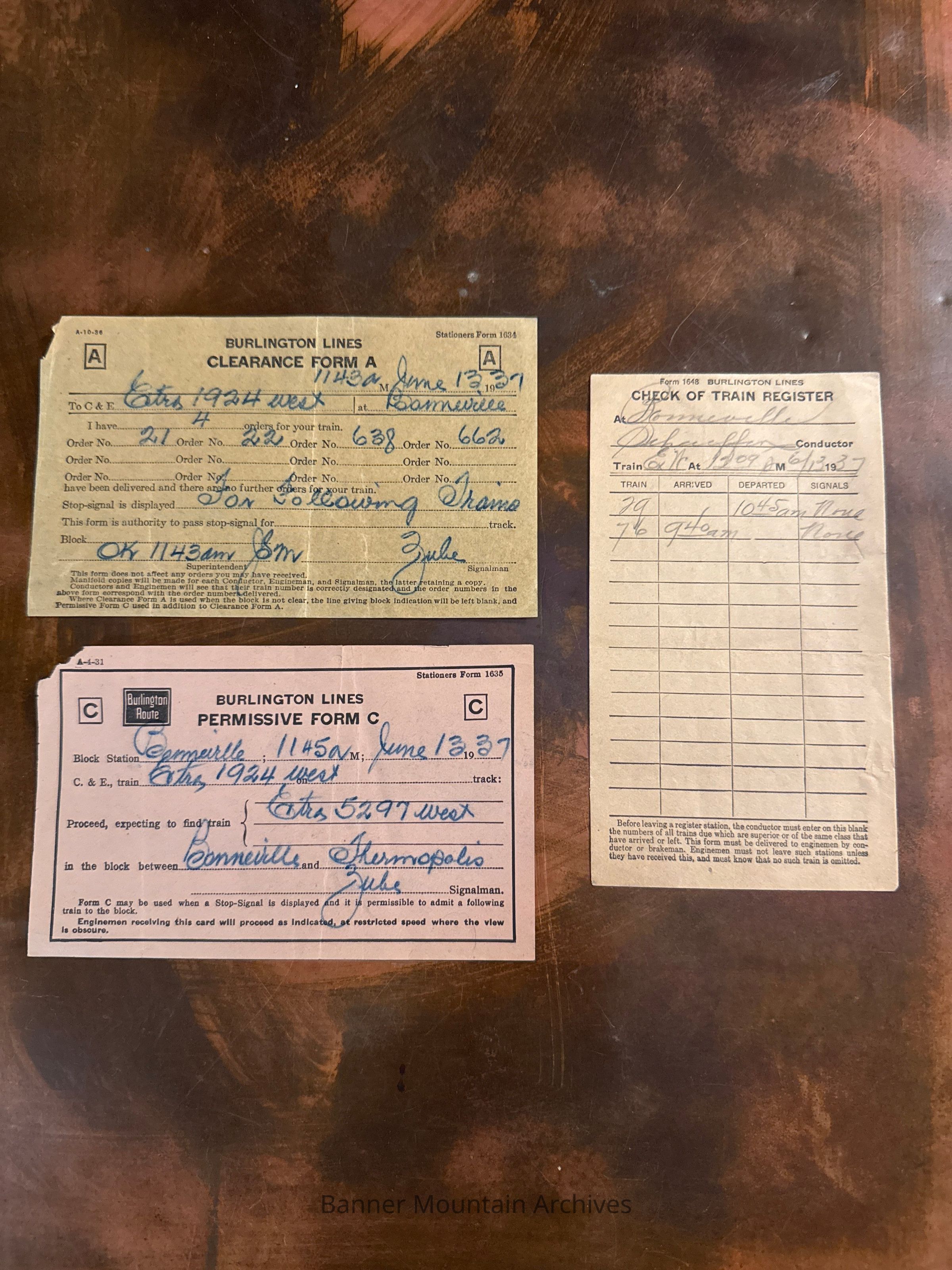 CB&Q clearance form A to the conductor and engineer on Extra 1924 west at Bonneville, WY, June 13, 1937.Creator