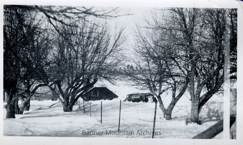 A.E. Chandler fuel truck at the Banner Ranch in the snow, circa 1940s.