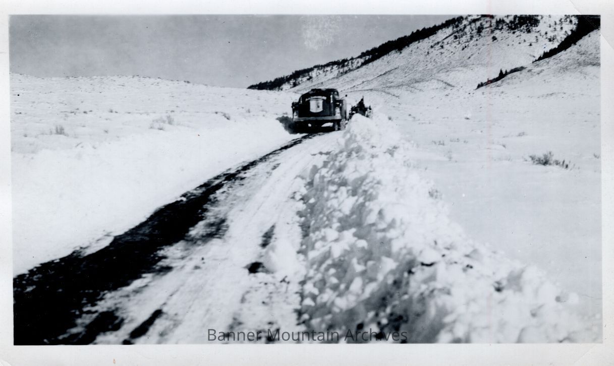 A.E. Chandler fuel truck following a Caterpillar plowing snow into the Banner Ranch, circa 1940s.