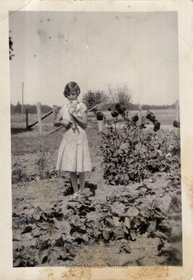 Girl with a kitten in a garden.