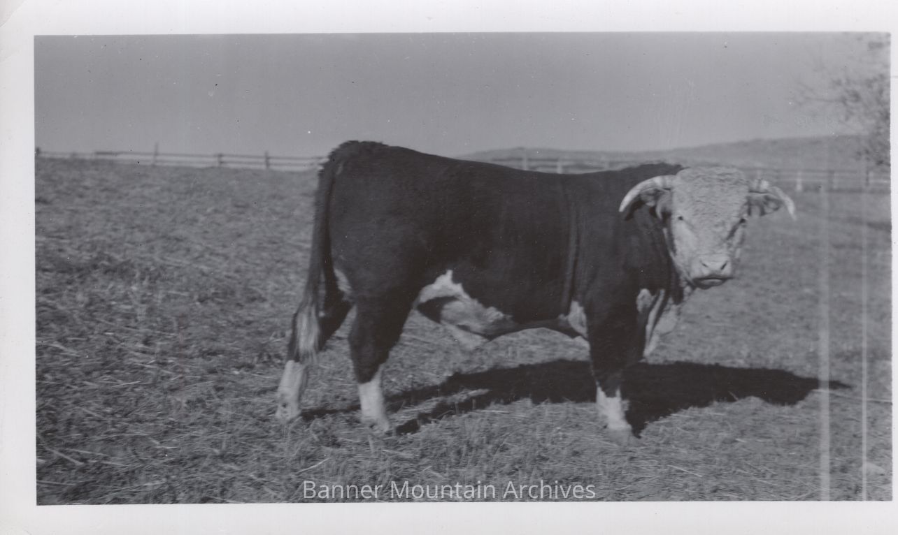 Hereford bull on the Banner Ranch, circa 1930s.