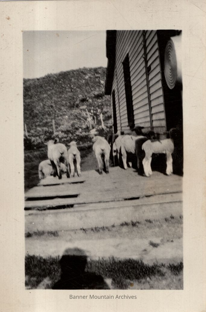 Banner Ranch lambs outside the original Banner Ranch house, circa 1930s.