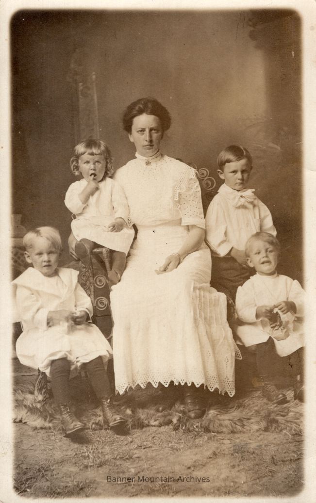 Postcard image of Laura McCleary with Carrie Miller's boys, Glen, Lowell, Ray and Everal, circa 1912.Subject Person/Organization