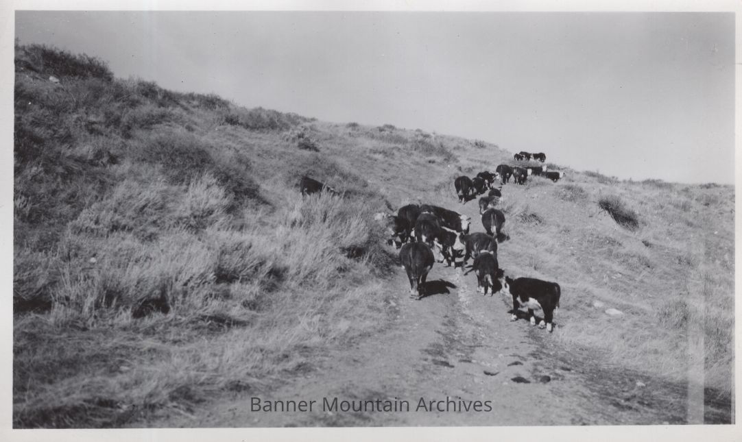 Moving Hereford cattle on the Banner Ranch, circa 1930s.