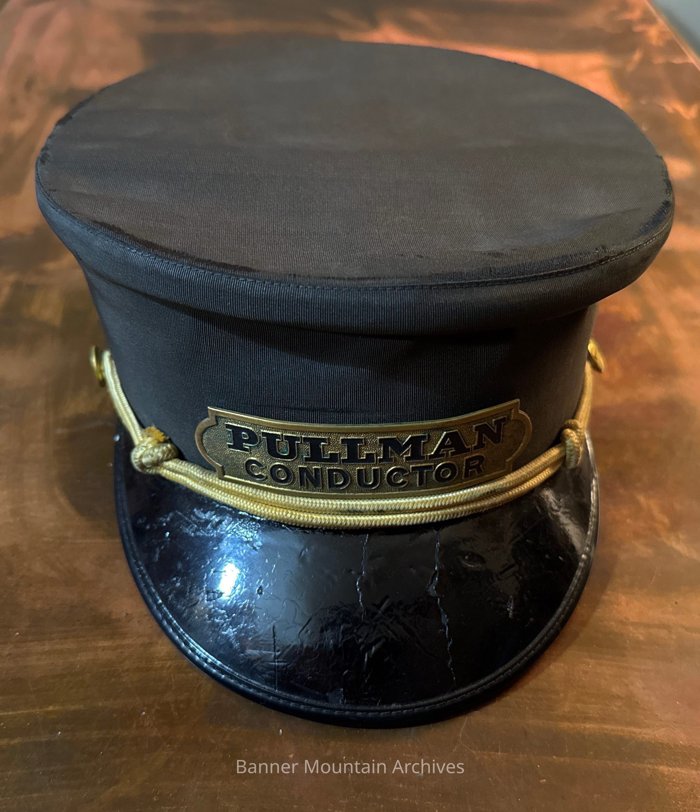 Pullman Conductor's hat, gold conductor's hat badge, Gold buttons and yellow band, black leather brim, black fabric.Category