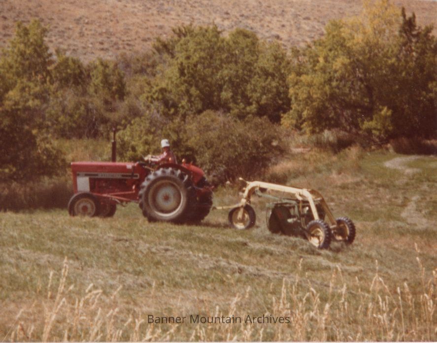 Terry Henderson raking hay on the Banner Ranch, circa 1980s.