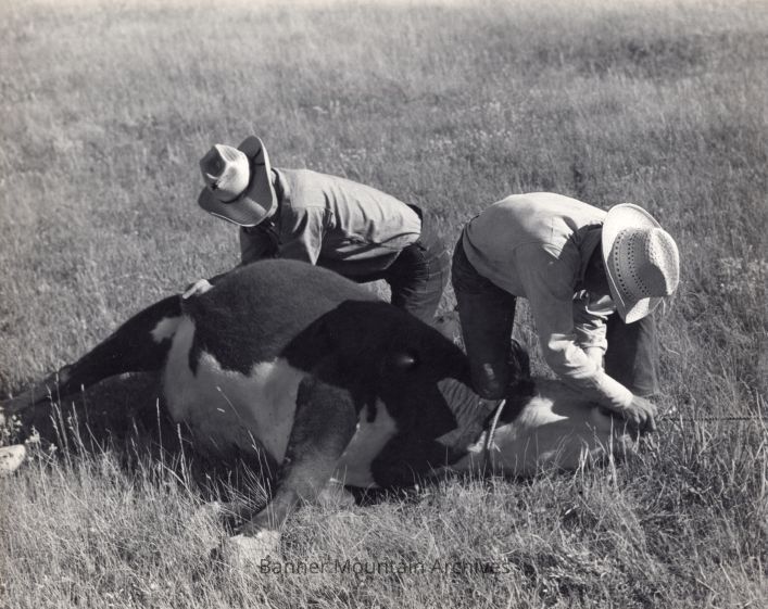 Roping a cow on the Banner Ranch, circa 1950s.