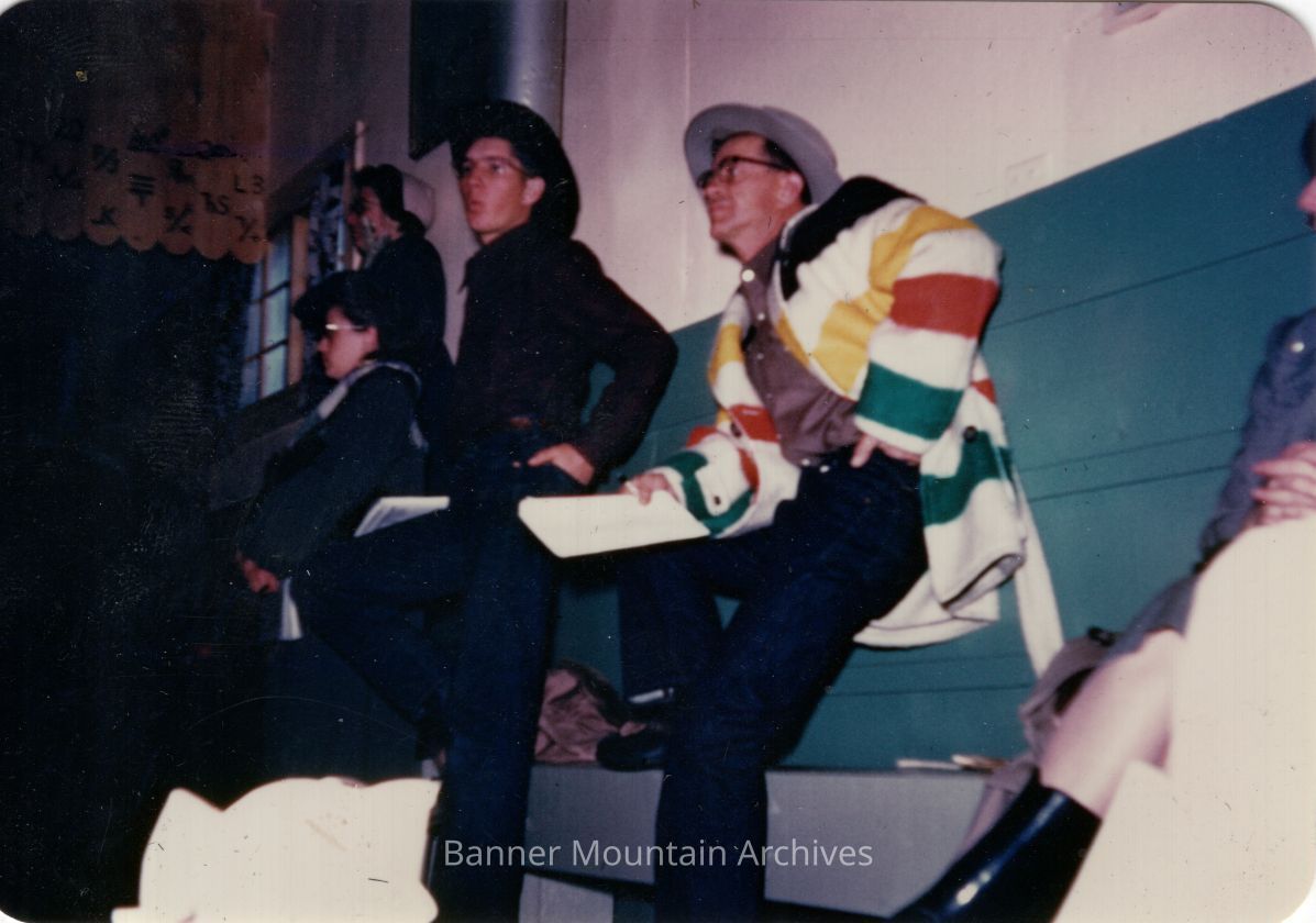 Crowd at the salebarn, possibly Bryant "Cactus" McCleary in the center, possibly Mike Stevens father to the right, circa 1950s.Photograph Details