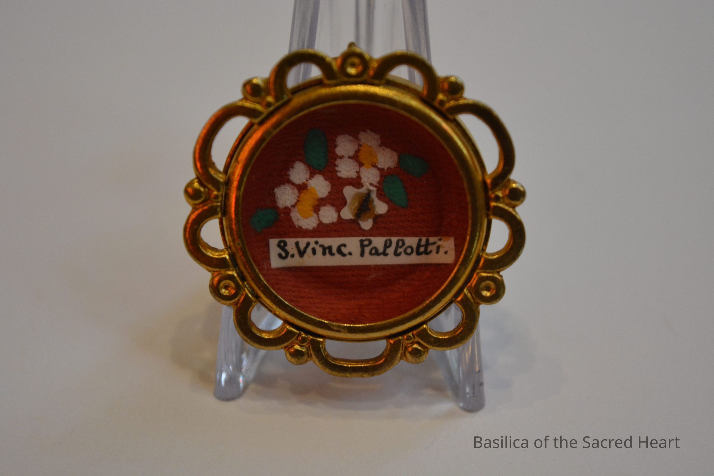 Bone relic of St. Vincent Pallotti, confessor, attached to a white paper star on a backing of red fabric. Fabric is decorated with painted white flowers and green leaves. Paper label reads, "S. Vinc. Pallotti." All contained in a round, brass theca.