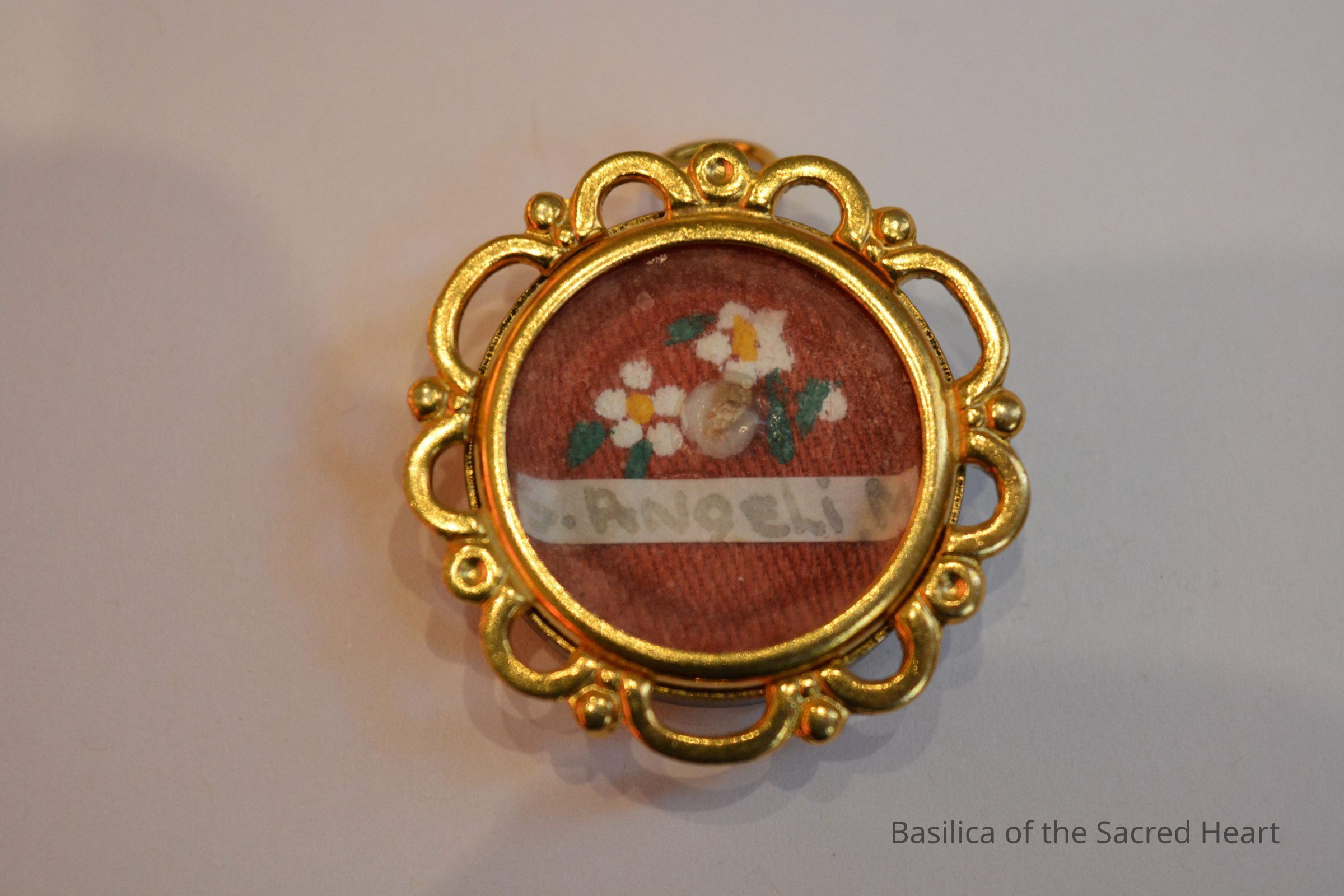 Bone relic of St. Angelus, martyr attached to a red fabric backing with painted white flower decorations. Paper tag reads "S. Angeli. M" All is contained in a brass theca.Context